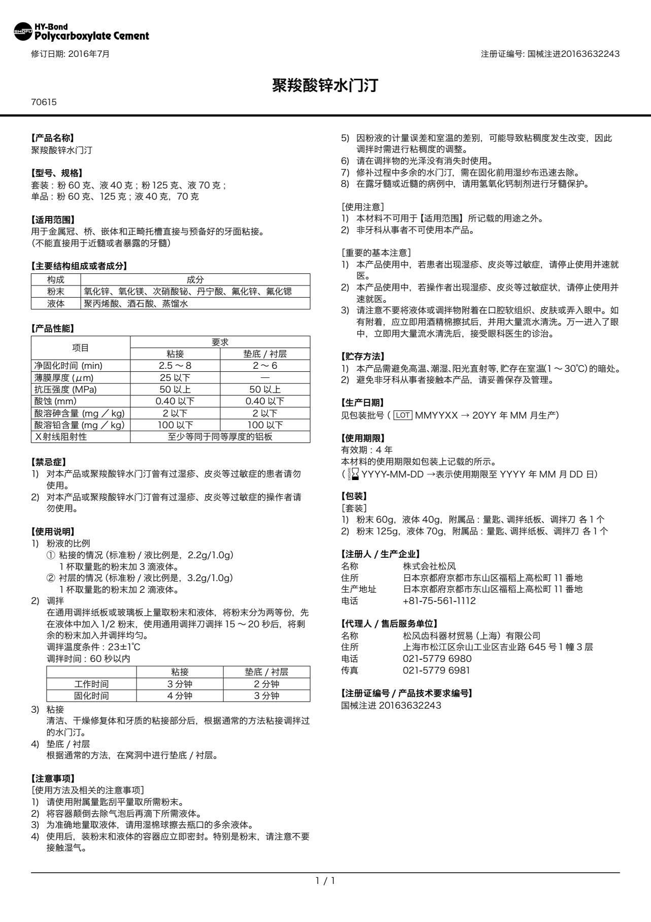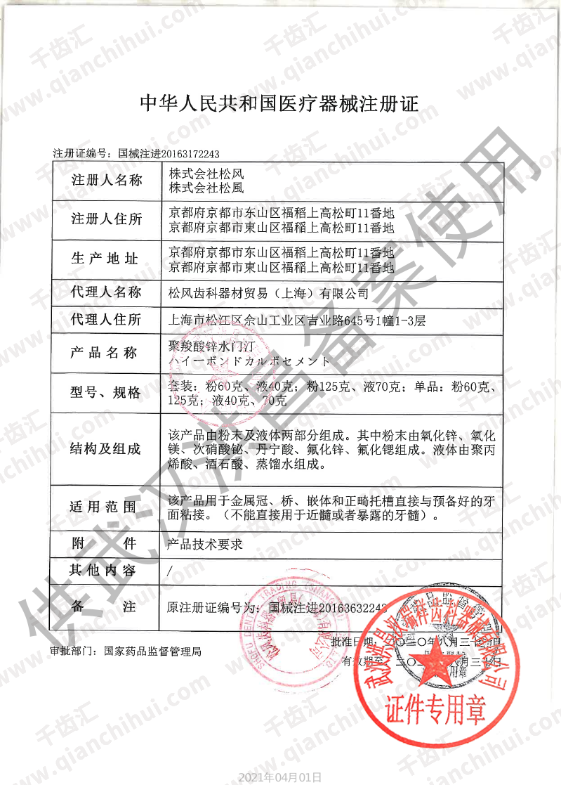 松风 HB聚羧酸锌水门汀(粘接类)无酸水门汀