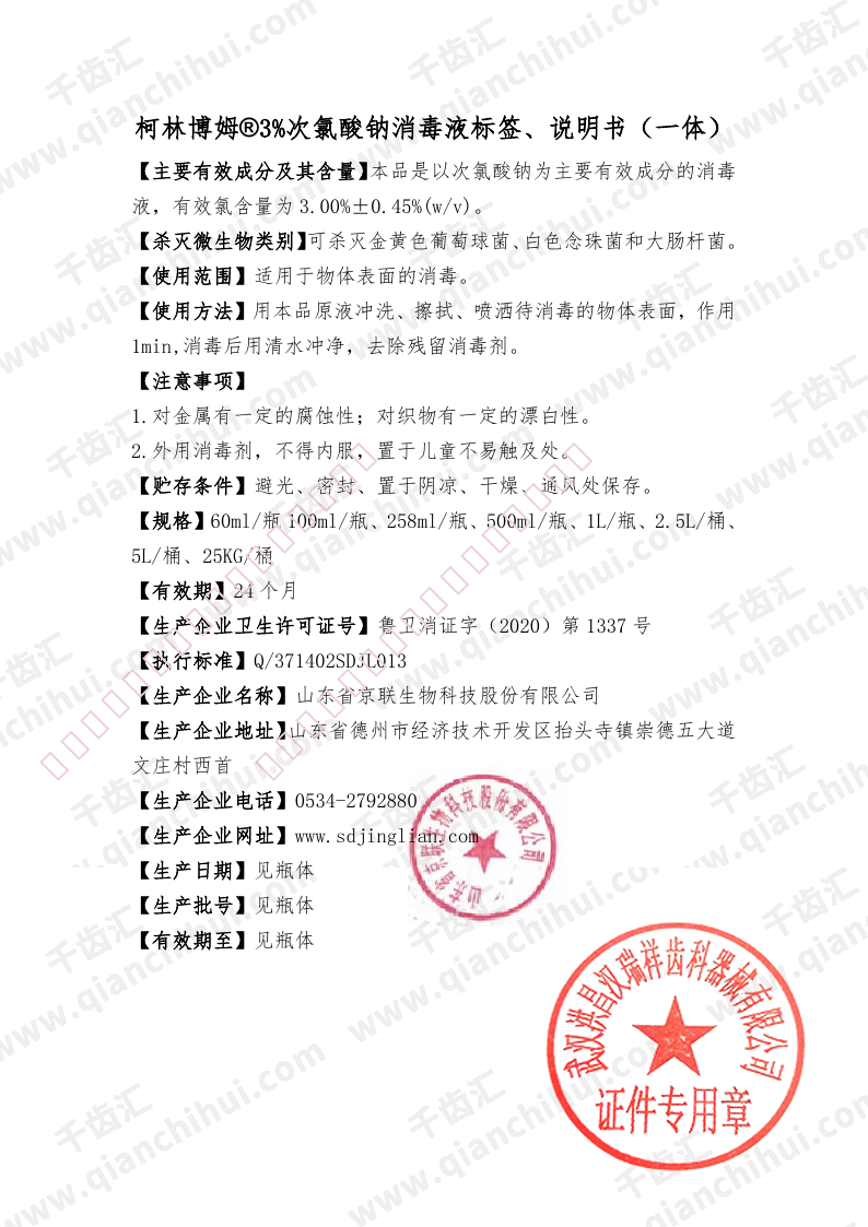 柯林博姆 3%次氯酸钠消毒液 258ml/瓶