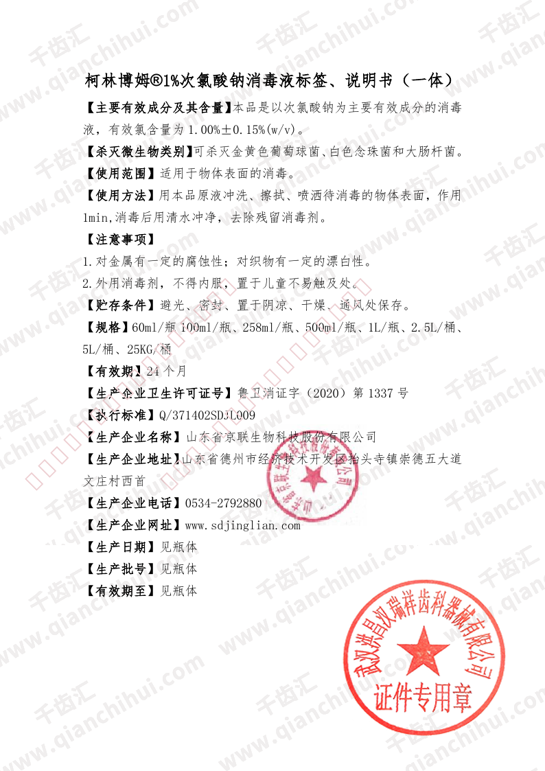 柯林博姆 1%次氯酸钠消毒液 258ml/瓶