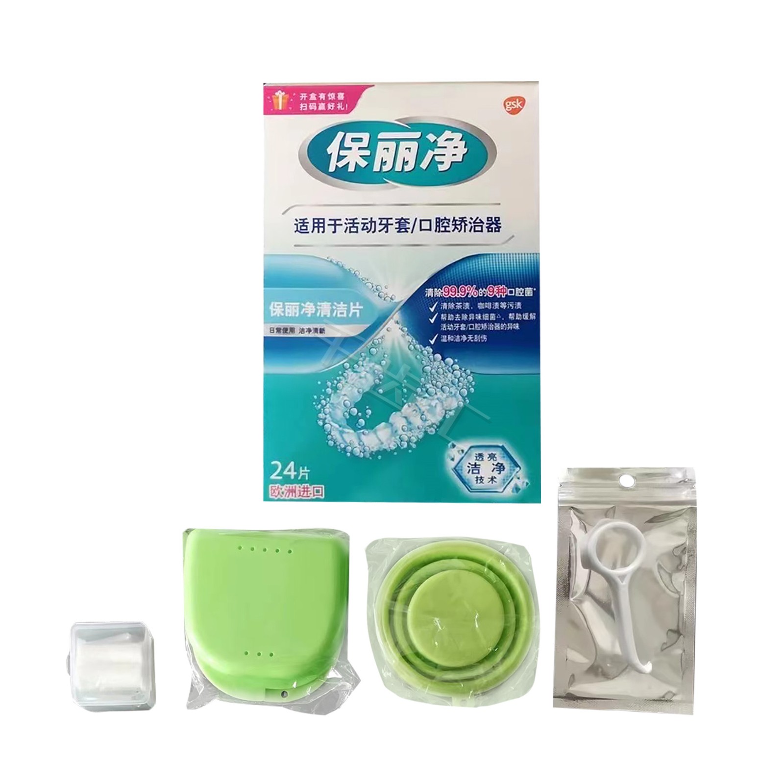 保丽净 正畸套装/口腔矫治器护理套装(假牙清洁片2盒+咬胶1盒+摘取器1份+保持器盒1个)